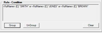 The FullName Booking File Field remains the selected item, so repeat above steps for inserting the name JONES and BROWN where necessary. Once complete the Rule-Condition screen should look like the image below:
