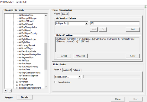 Select Segments, Air, AirVendor from the Booking File Fields list, then specify Is Equal To [=] and add AF. Click Add to add details in to our existing Rule Condition and therefore completing the Rule Condition. Our rule now states If Name contains SMITH, JONES or EVANS and Account Number is 12345 and Air Vendor is Air France.